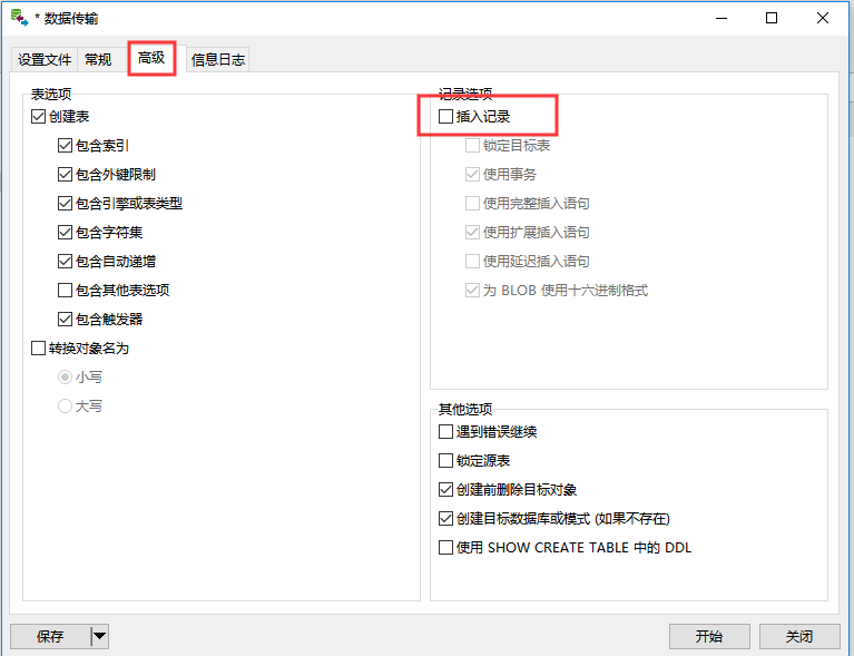 若是只想导出表结构,不导出表数据:选择 高级 --》取消勾选插入记录