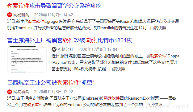 - 12月7日 ,新生代勒索软件Egregor连续得手,先后拿下了美国零售巨头Kmart和加拿大温哥华市公共交通机构TransLink,并导致后者的运营瘫痪长达两天。