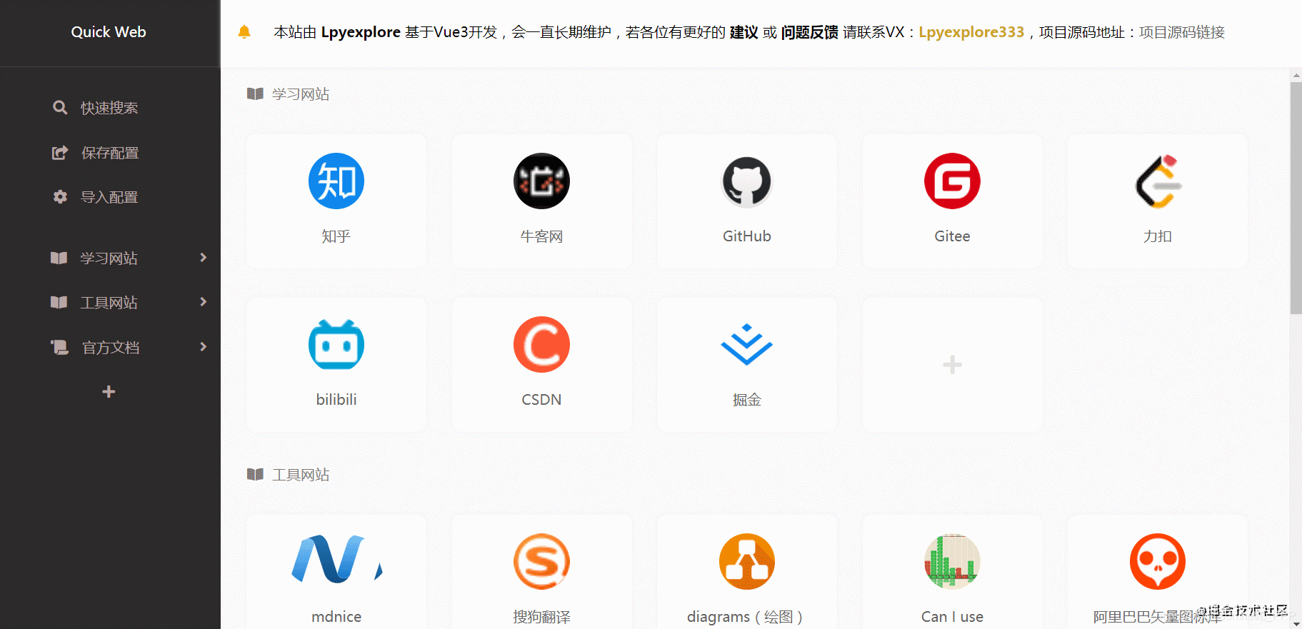 有些小伙伴问,为啥不做一个账号登录的网址导航栏,这样到哪都不用带着配置文件了,只需要记住账号密码就可以了。我又要强调本项目的选择了,能不用服务器就不用服务器,能不用数据库就不用数据库,用你自己的本地的 localStorage 作为数据库存储,你不是更放心嘛,比如你收藏了一些奇奇怪怪的网站,反正就只有你知道,我反正肯定是不知道的 😏 而且细心的小伙伴有没有发现,我连静态页面都不是用的自己的服务器,直接部署在码云上的