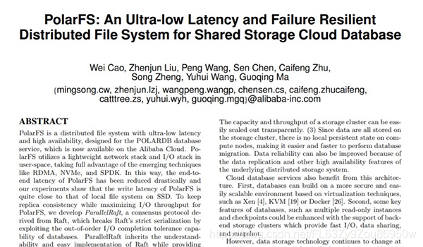 阿里云方面表示,该产品实现了两大技术突破:通过自研超低延迟文件系统PolarFS大幅降低数据跨网络的延迟,并且开发了一种全新的共识协议ParallelRaft,提升系统吞吐量。在此之前,PolarFS的研究成果已发表在数据库顶级会议VLDB 2018 《PolarFS: An Ultra-low Latency and Failure Resilient Distributed File System for Shared Storage Cloud Database》。