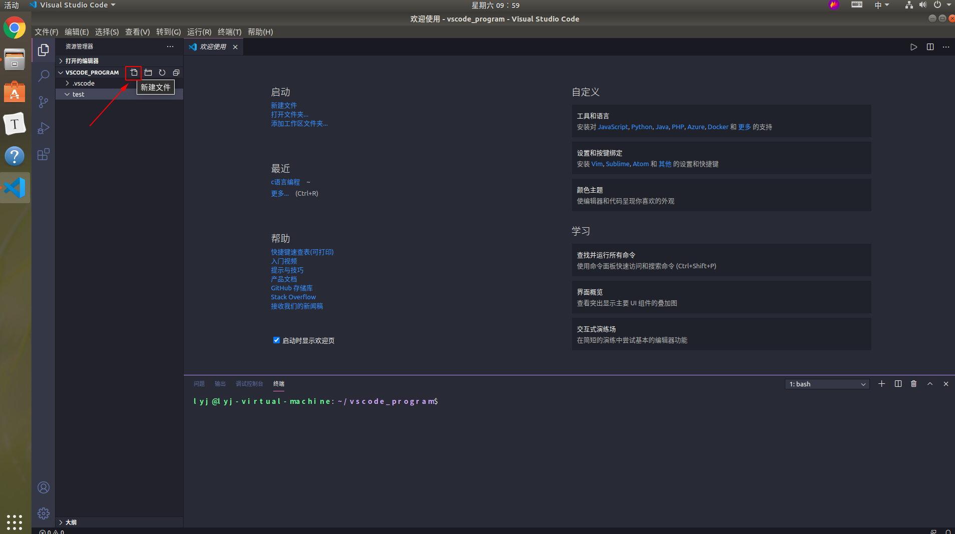 - 在VScode中打开该文件夹(即工作目录)并新建子文件夹test存放编写的程序和生成的可执行文件,然后再新建一个C语言程序RevertNum.c。