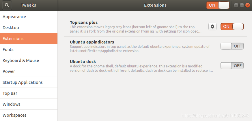 - 命令行安装“sudo apt install gnome-tweak-tool gnome-shell-extension-top-icons-plus”。运行“优化”应用程序,设置打开任务缩小到任务栏,如图所示