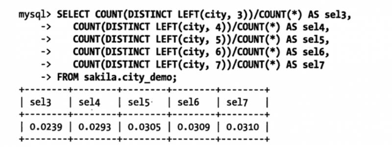 查询显示当前缀长度到达7的时候,再增加前缀长度,选择性提升的幅度已经很小。