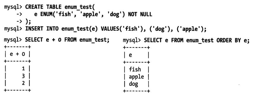 从上图中的select e + 0 from enum_test;的结果可以看出,MySQL在内部会将每个值在列表中的位置保存为整数,可以与整数进行算术运算。
