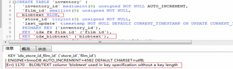 [Err] 1170 - BLOB/TEXT column 'blobtext' used in key specification without a key length