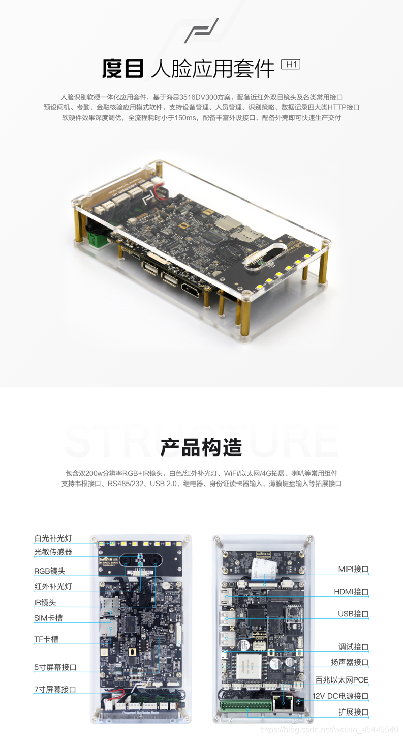 据了解,度目人脸应用套件具备高性能、易开发、拓展灵活三大特色。在性能上,度目人脸应用套件人脸识别全流程在150ms以内,识别准确率超过了99.7%,支持20W的人脸底库管理;在开发易用性方面,该硬件预设了大量场景APP,开发者可以根据具体业务进行修改;拓展性上,支持USB2.0、继电器、报警、键盘、身份证读卡器、麦克风等外设接口,模块化结构方便开发者根据自身需求进一步扩展功能。