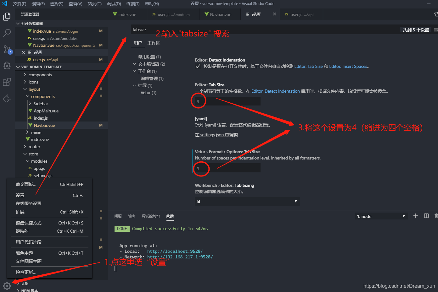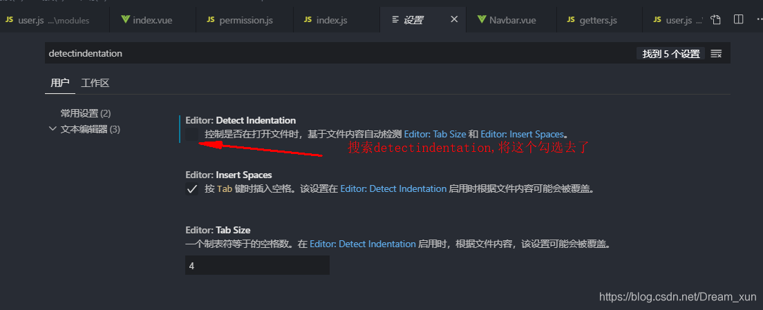 1.在设置中搜索“tabsize” ,将下图中两个地方都改为4