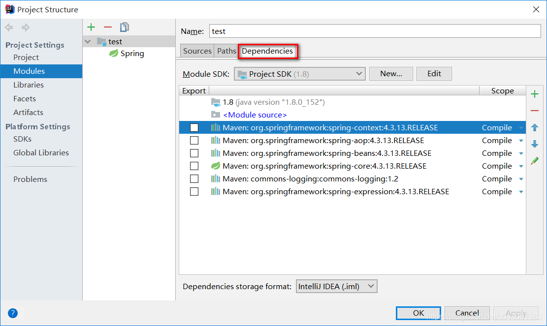 在Project Structure的Modules选项卡的Dependencies页面中,可以查看Maven所引用的项目。