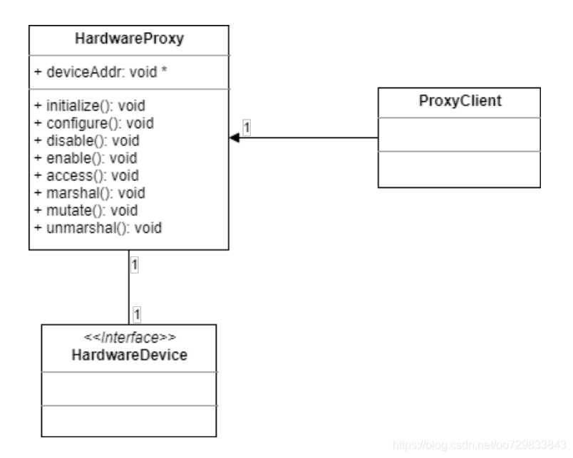 模式结构非常简单,可能客户会有多个,但是每个硬件设备仅有一个硬件代理,客户只能访问代理接口,无法直接访问硬件就是这个模式的目的。