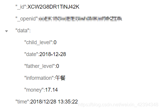 添加之后数据库里的结构是这样的:(_id, _openid字段是默认插入的,openid就是用户的认证信息)