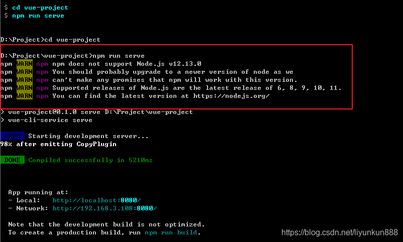 出现如图红框所示的提示,就搭建成功,进入项目目录,直接输入 npm run serve 就可以了