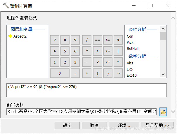 2、根据题意,需要提取坡向90~270之间的数据。(两种方法,栅格计算器和重分类工具,经检验,栅格计算器提取效果更好,故选取栅格计算器)
