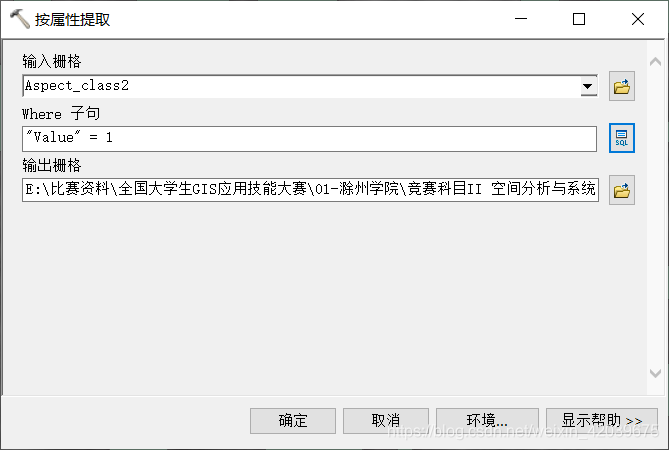 (3)打开【Spatial Analyst 工具】——【提取分析】——【按属性提取】工具,输入计算后的坡度数据,并打开查询构建器,输入相应SQL语句