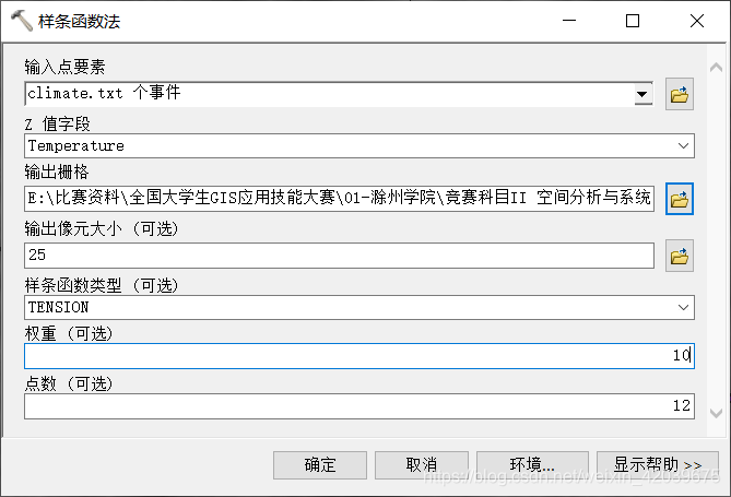 5、打开【Spatial Analyst 工具】——【插值分析】工具,经过反复检验,比较不同的插值方法后,最终选择【样条函数法】,输入点要素climate数据,Z值字段选择Temperature,样条函数类型选择TENSION,权重取10,点数默认,点击确定,生成结果