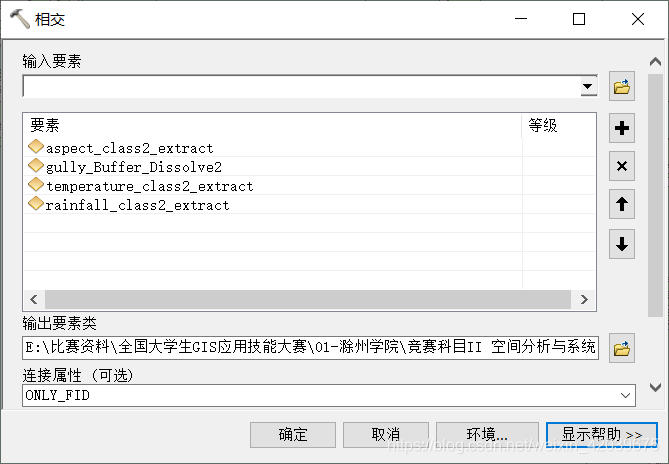 7、经分析,将矢量坡向、温度、降雨量数据和缓冲区数据求交集,便可以得到X型作物适宜区。打开【分析工具】——【叠加分析】——【相交】工具,输入相应要素,连接属性选择ONLY_FID