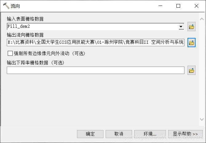 (2)打开【Spatial Analyst工具】——【水文分析】——【流向】工具,输入填洼结果数据,进行流向分析