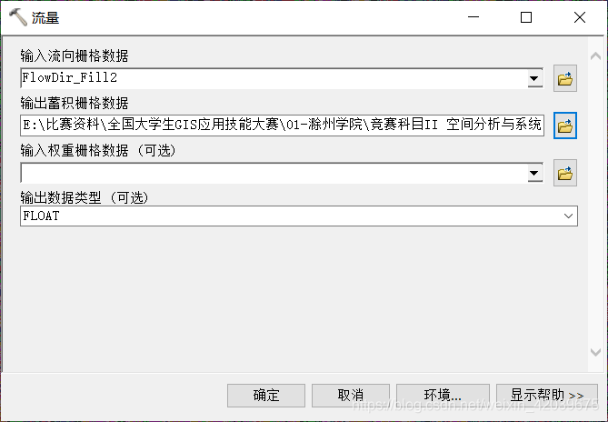 (3)打开【Spatial Analyst工具】——【水文分析】——【流量】工具,输入流向分析结果数据,进行流量分析