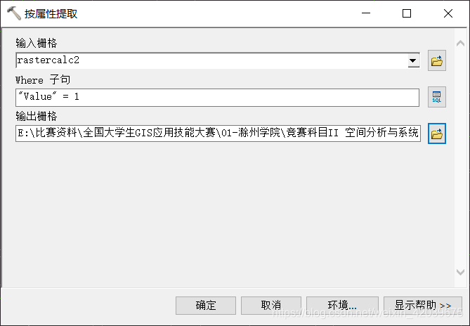(5)打开【Spatial Analyst工具】——【提取分析】——【按属性提取】工具,选择属性值为1的进行提取