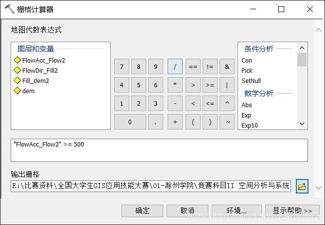 (4)打开【Spatial Analyst工具】——【地图代数】——【栅格计算器】工具,根据对河流特性,对需要提取河网密度情况,设置一定的阈值,分别尝试300,500,800,最后选取500作为最终阈值