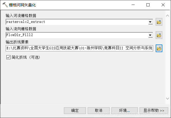(6)打开【Spatial Analyst工具】——【水文分析】——【栅格河网矢量化】工具,输入河流栅格数据和流向栅格数据,进行栅格河网矢量化