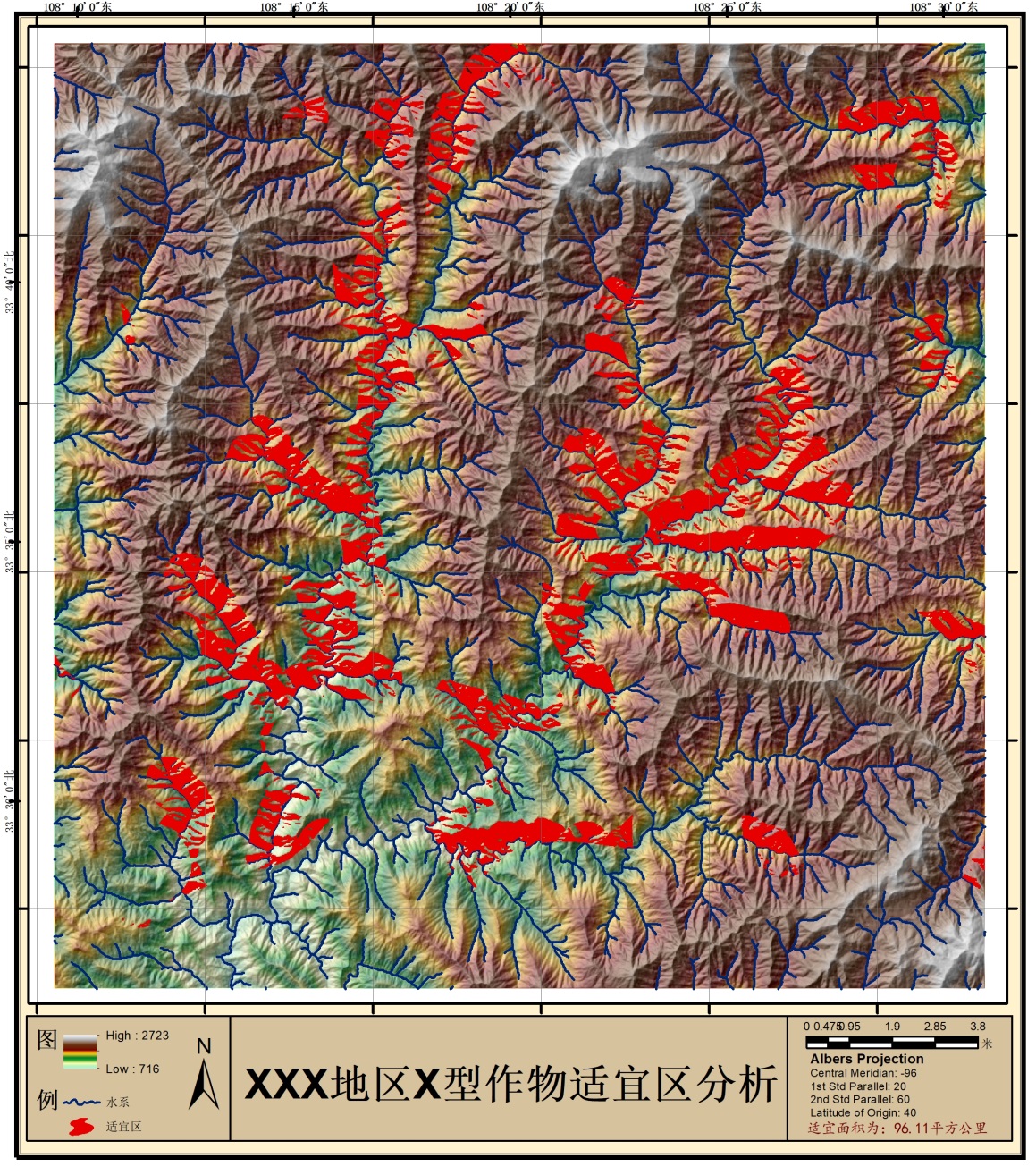 5、对4个矢量区域求交集,即可得到X型作物生长适宜区,并制作专题图。