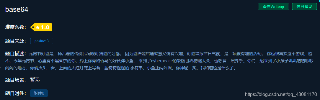 题目描述:元宵节灯谜是一种古老的传统民间观灯猜谜的习俗。 因为谜语能启迪智慧又饶有兴趣,灯谜增添节日气氛,是一项很有趣的活动。 你也很喜欢这个游戏,这不,今年元宵节,心里有个黑客梦的你,约上你青梅竹马的好伙伴小鱼, 来到了cyberpeace的攻防世界猜谜大会,也想着一展身手。 你们一起来到了小孩子叽叽喳喳吵吵闹闹的地方,你俩抬头一看,上面的大红灯笼上写着一些奇奇怪怪的 字符串,小鱼正纳闷呢,你神秘一笑,我知道这是什么了。