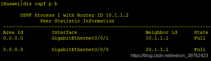 dis this或者dis ospf peer brief 查看动态路由设置是否正确,应该显示的是下一跳的ip,后面的状态是full(比较慢,如果dis this中出现了,但是在dis ospf p b中还没有出现,可以等一会)