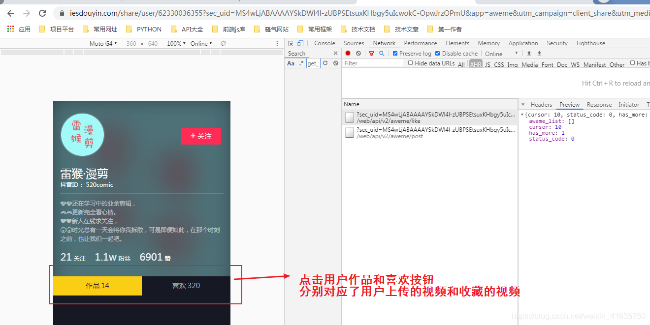 - 点击作品和喜欢,可以抓包到请求的链接,这个我们稍后分析