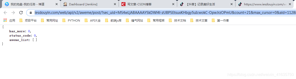 - 请求结果如下,因抖音的检测机制,你需要刷很多次才有数据,这个我们通过循环判断aweme_list中是否有数据即可