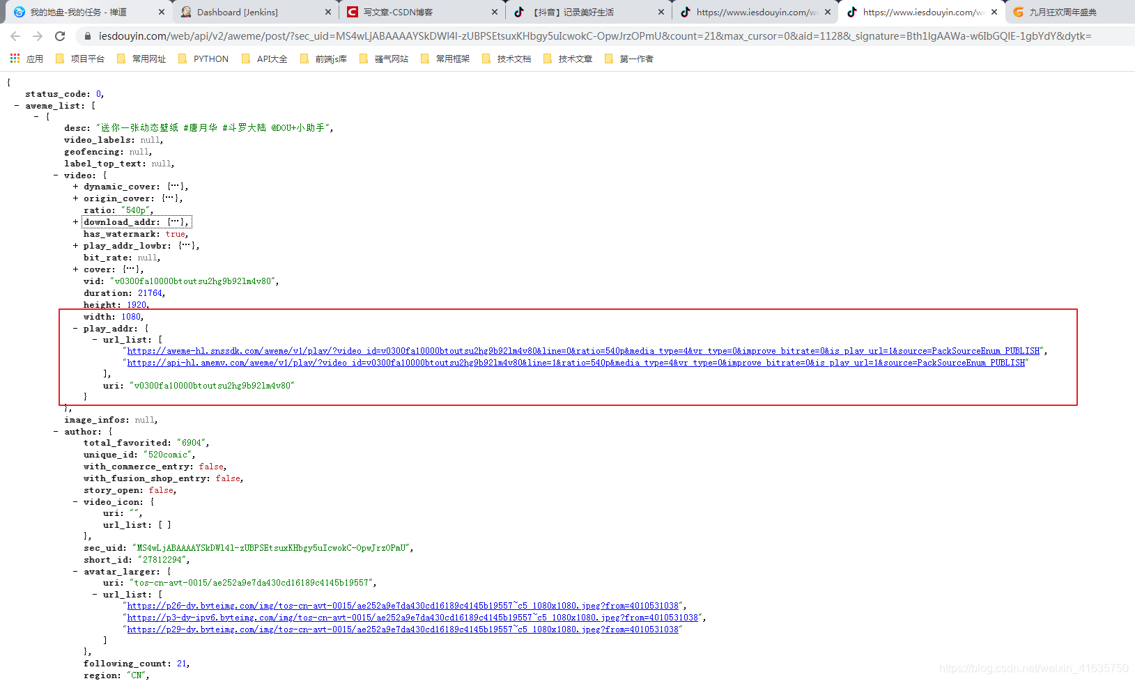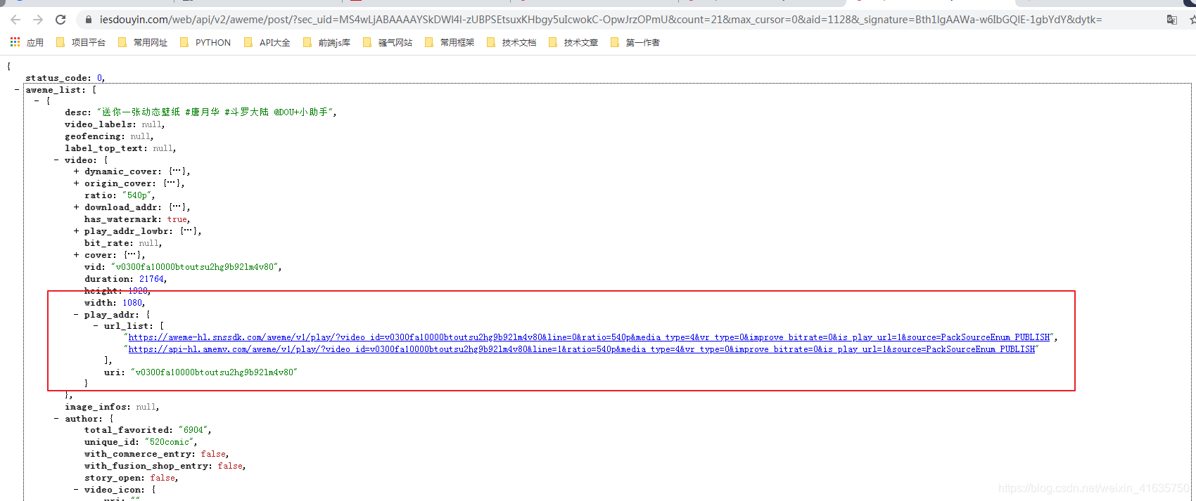 - 可以看出每个视频有两个链接,自己访问一下就知道,一个链接是用户上传的原视频,另一个是抖音那边加了水印的视频