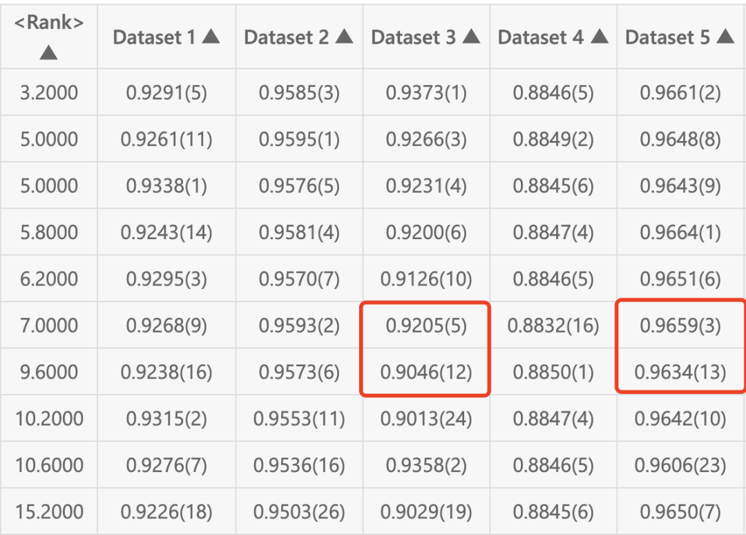同时,从下图4可以发现,不同于传统的固定数据集评测数据挖掘竞赛,保证多个类型,分布差异大的数据集排名的稳定性相比于优化某个数据集的精度更为重要。例如,数据集5模型精度差异仅有0.15%,却导致了十个名次的差异,数据集3模型精度差异有1.6%,却仅导致7个名次的差异,因而我们需要采用排名鲁棒的建模方式来增强数据集排名的稳定性。
