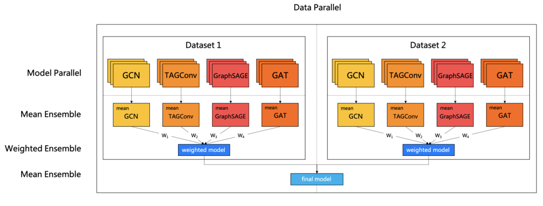 稠密度自适应带权融合:如图4所示,由于某些图数据集较为稀疏且无特征太容易拟合,选手间精度相差小但是排名差异却较大。例如,数据集5模型精度差异仅有0.15%,却导致了十个名次的差异,数据集3模型精度差异有1.6%,却仅导致7个名次的差异,因而我们对于多种图模型采用了稠密度自适应的融合方式。